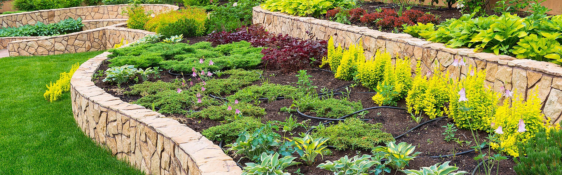 Neben den Pflanzen bezogenen Arbeiten bieten wir auch eine ganze Reihe an strukturierenden Leistungen, wie zum Beispiel Terrassenbau, Wegebau, Einfassungen oder Natursteinmauern an.